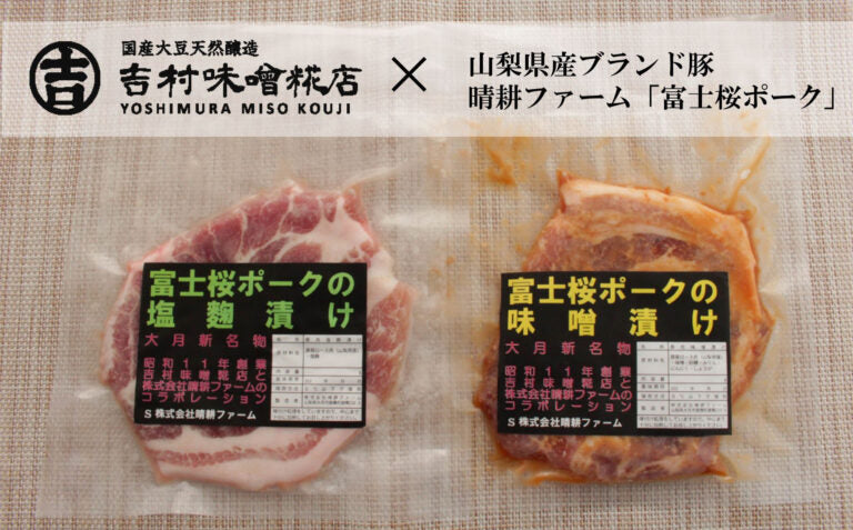山梨県産のブランド豚である「富士桜ポーク」を、大月市有名老舗「吉村味噌糀店の無添加国産にこだわった味噌と塩麹」でじっくり漬け込みました。自信をもってお届けするコラボレーション商品です。ぜひご賞味ください。