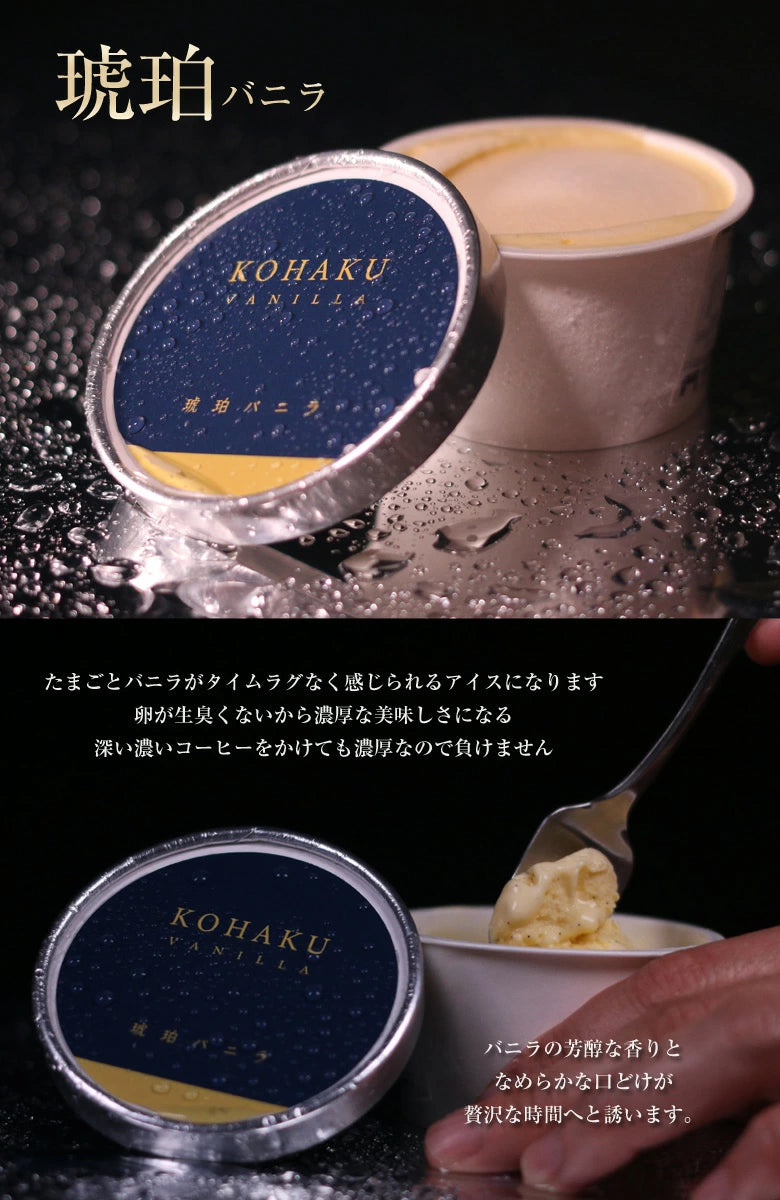 【原材料】琥珀バニラ:牛乳(国内製造)、生クリーム、卵黄、グラニュー糖、スキムミルク、トレハロース、バニラビーンズ