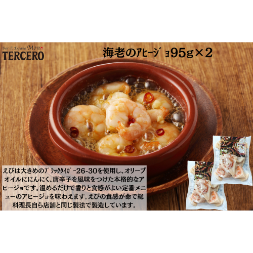 温めるだけで香りと食感がよい定番メニューのアヒージョを味わえます。えびの食感が命です。