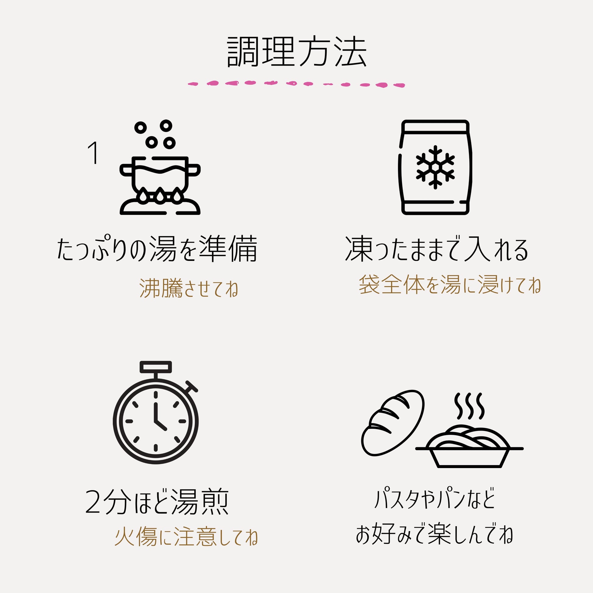 湯煎で約2分解凍後、パンや温野菜に添えても、パスタ(乾麺100g)・リゾット(ご飯150g)にしても、そのままお召し上がりいただいても絶品です。